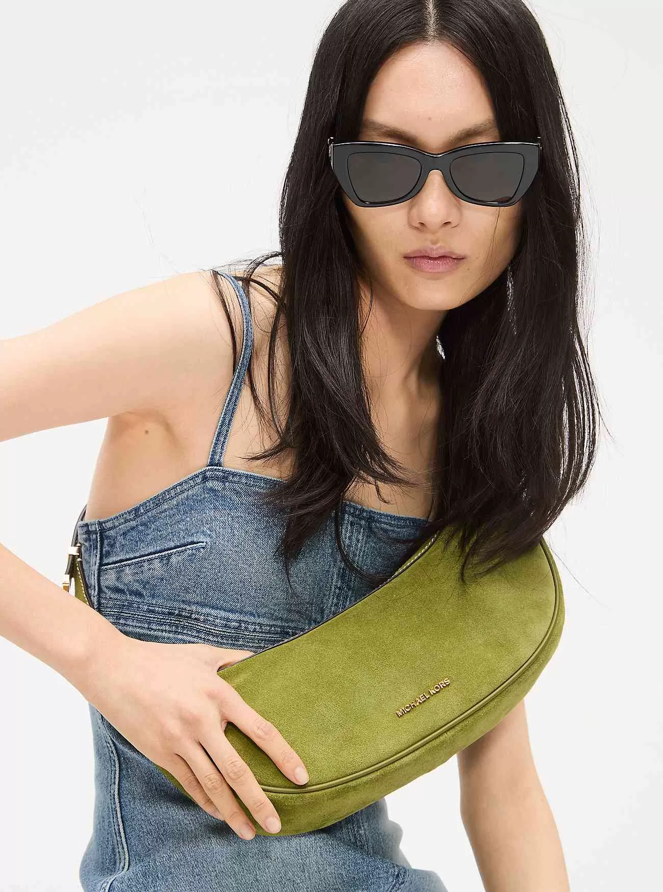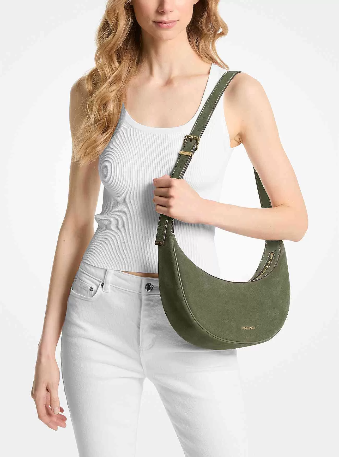 Vår Avra-väska kan vara det snyggaste sättet att bära med sig dina dagliga saker. Den är gjord av lyxig mocka i halvmåneform med en spännad rem som kan justeras till önskad längd. Den smala profilen gör den väl lämpad för hur många tillfällen som helst.