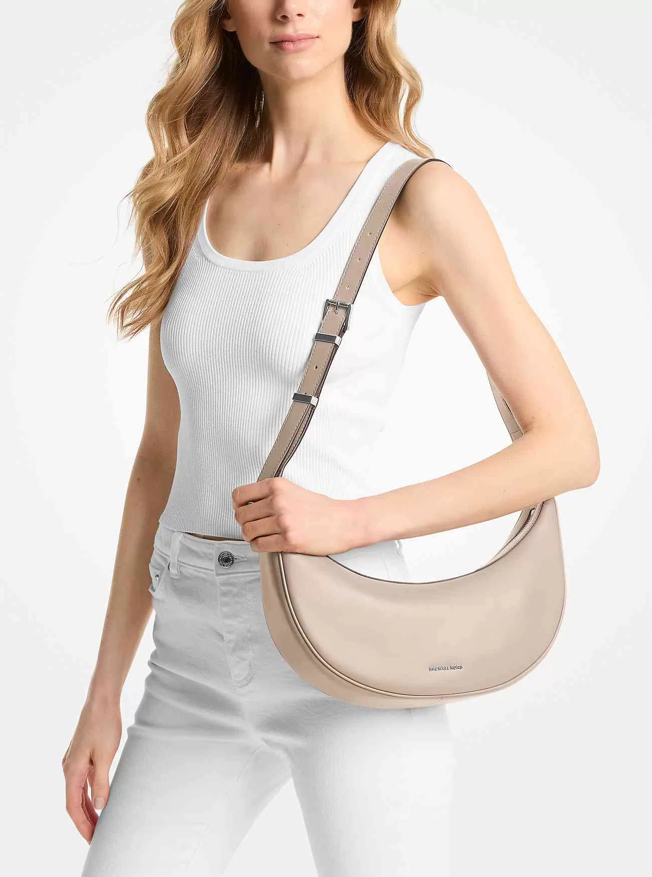 Vår Avra-väska kan vara det snyggaste sättet att bära med sig dina dagliga saker. Den är gjord av slätt läder i halvmåneform med en spännad rem som kan justeras till önskad längd. Den smala profilen gör den väl lämpad för hur många tillfällen som helst.
