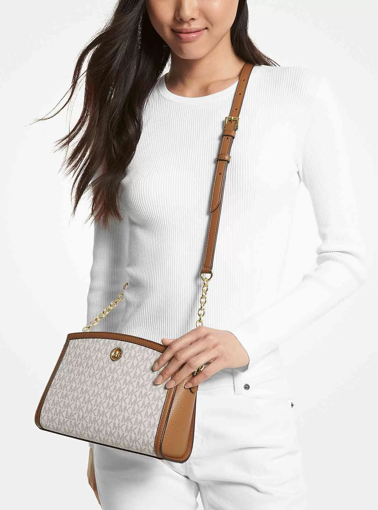 Med sin strukturerade siluett och glamorösa hårdvara är vår lädertrimmade Chantal messenger-väska ett måste i alla sofistikerade garderober. Den är tillverkad av Signature Logo-tryck och har en bakficka som säkert förvarar bara det viktigaste. Bär den i de robusta övre handtagen, eller via den avtagbara crossbody-remmen på mer hektiska dagar.