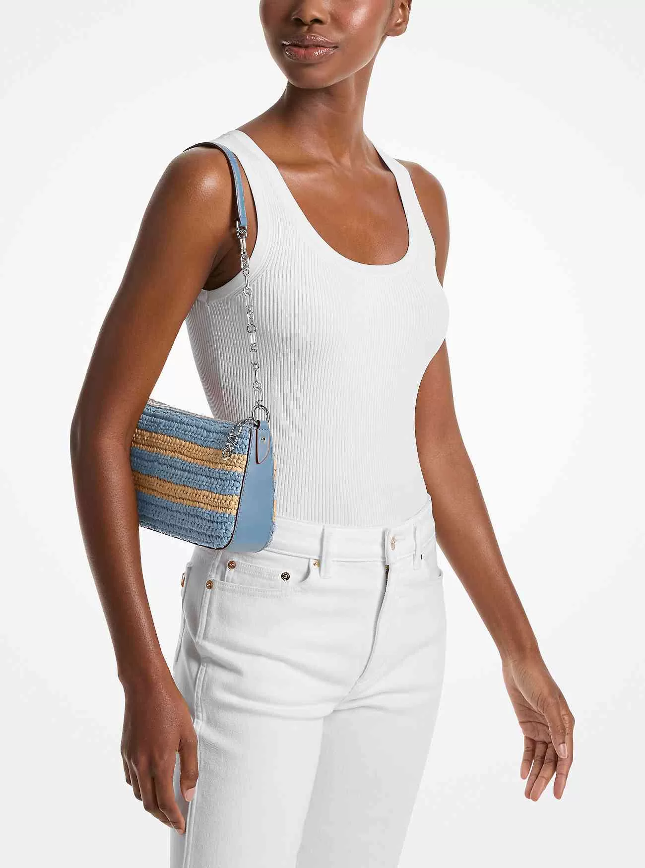 Designad i handvirkad halm med färgglada ränder, är denna petite pochette perfekt för de dagar du vill resa lätt. Med plats för din telefon, korthållare och solglasögon, har den kompakta siluetten en elegant kedjerem som utstrålar glamour när du är på farten.