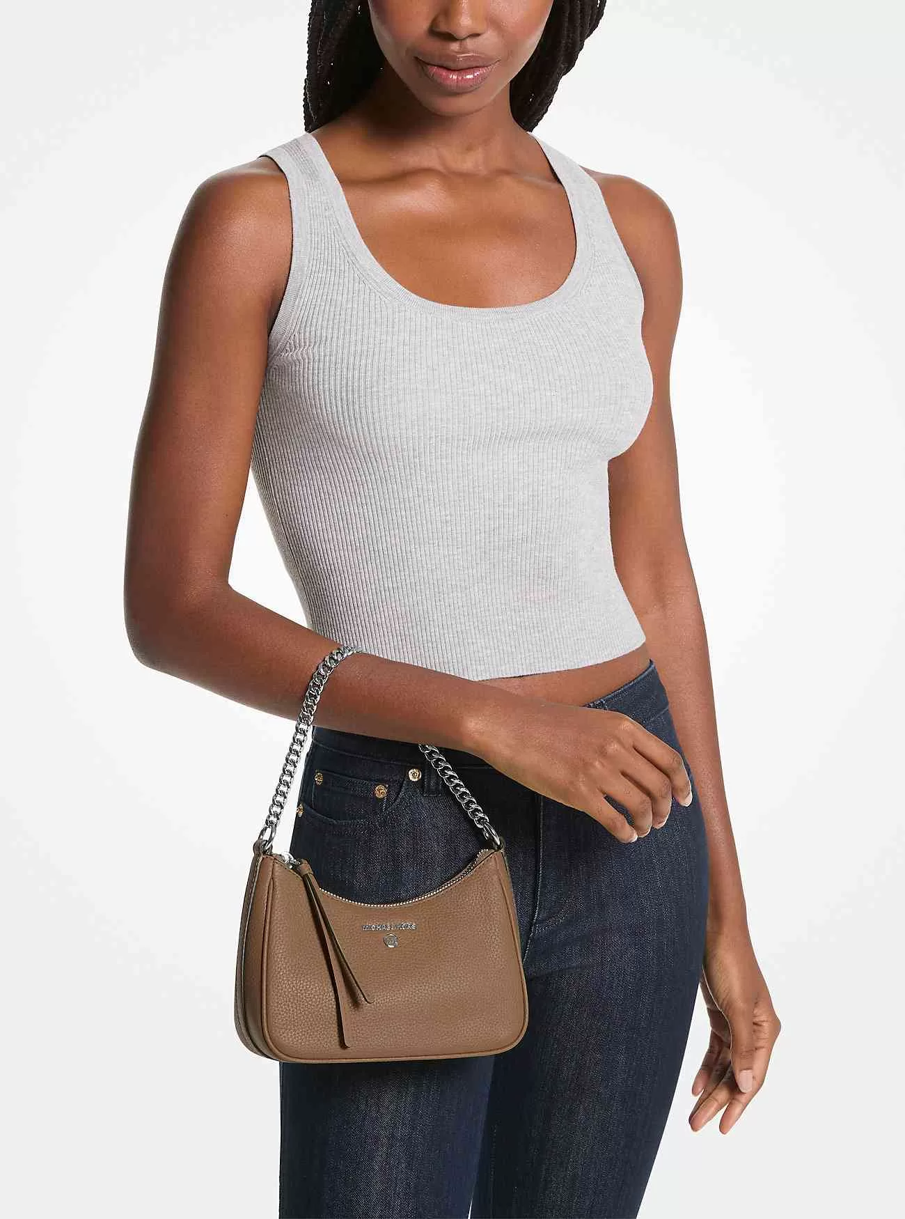Vår Jet Set Charm-pochette är tillverkad av läder med småsten i en liten, strukturerad siluett och har en förgylld kedjelänk för en tuff och lyxig finish. Oändligt mångsidig, den kan stylas med både klänningar och jeans.