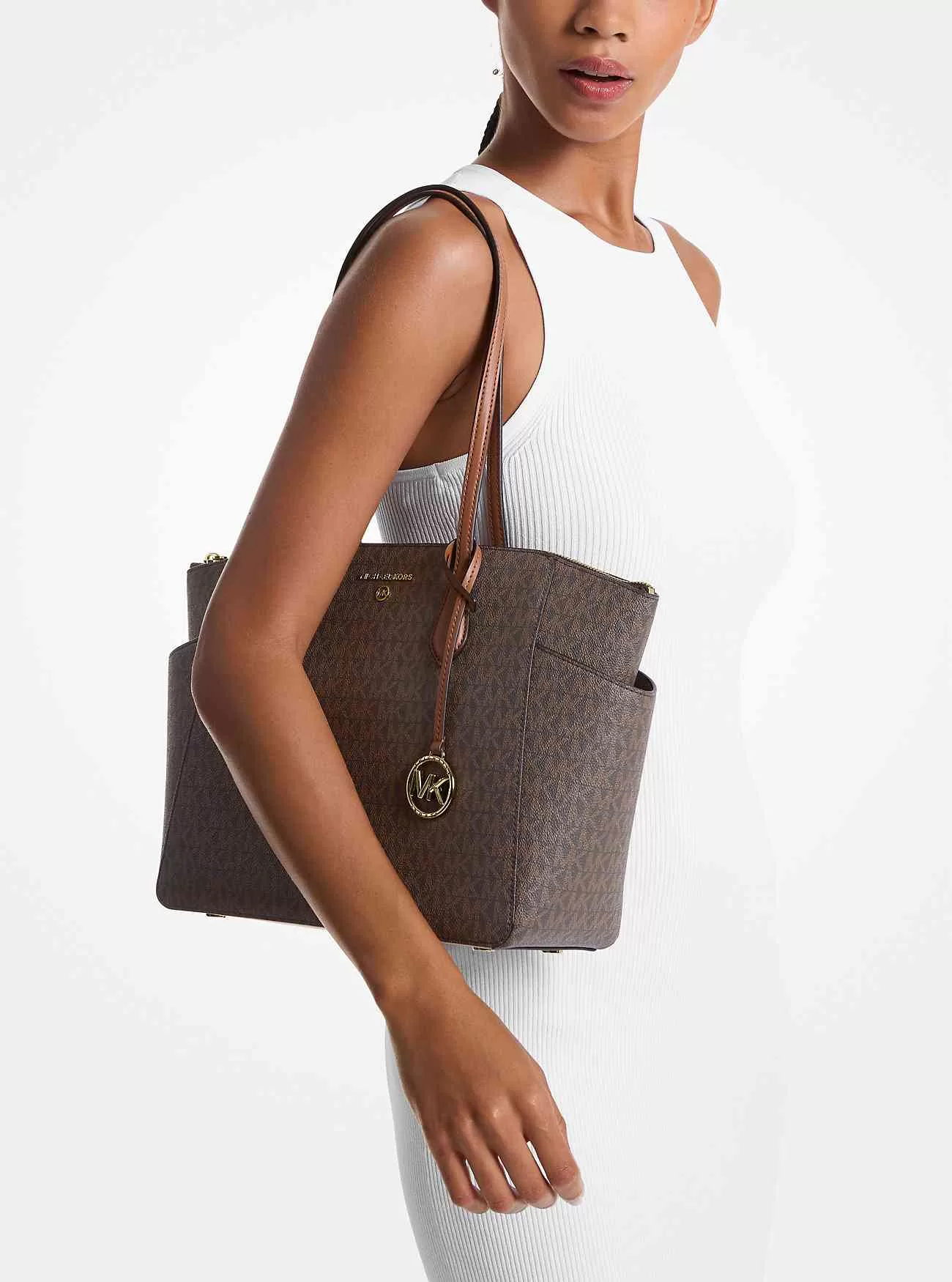 Vår Marilyn-väska är den ultimata väskan för vardagsbruk. Varumärkets ikoniska ”MK”-initialer lämnar ett minnesvärt märke, medan den strukturerade silhuetten öppnas för att avslöja en rymlig interiör med dedikerade fickor för dina dagliga nödvändigheter. Vi älskar hur de smala läderremmarna lätt glider över din axel för att göra det enkelt när du är på språng.
