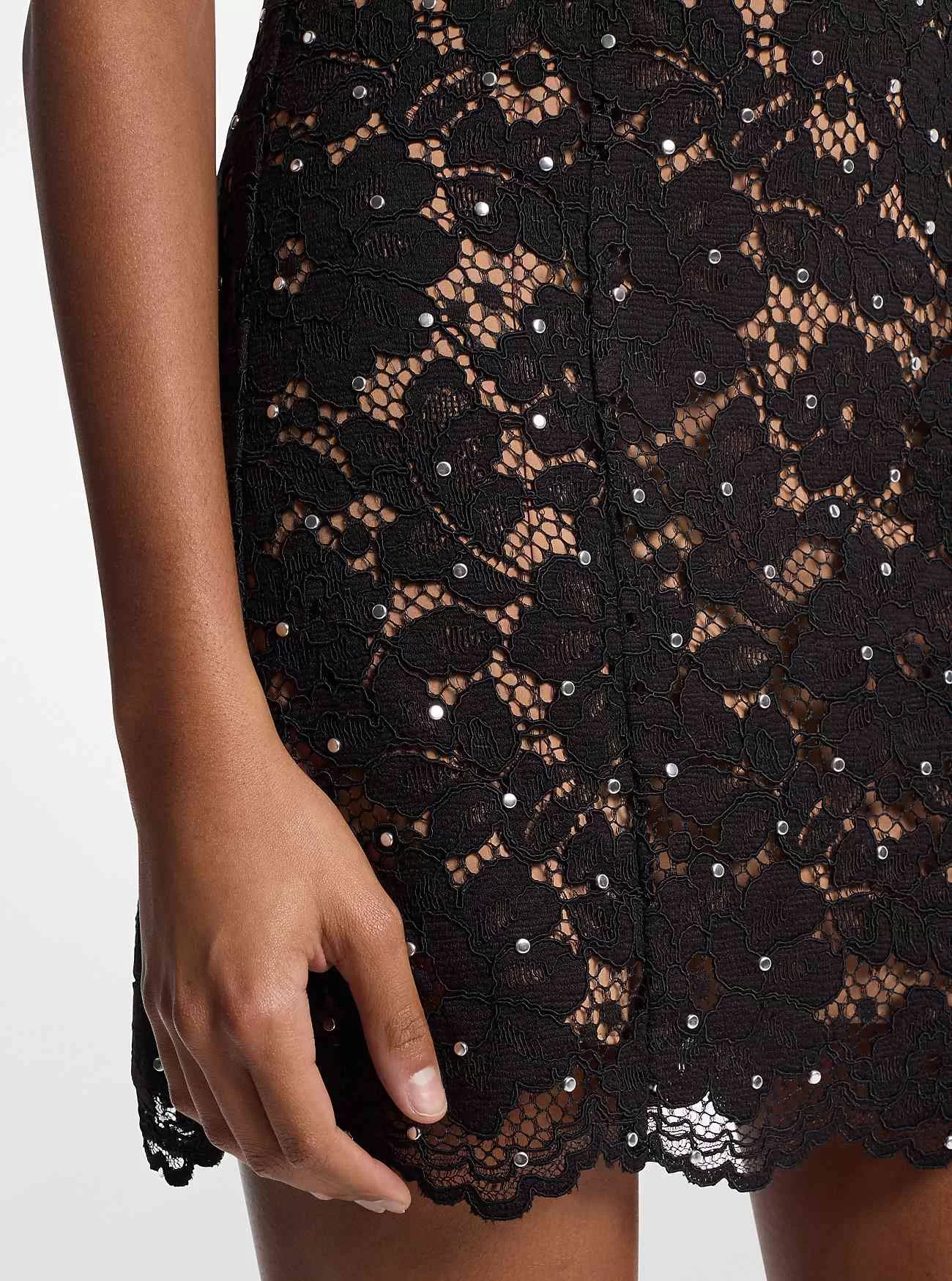 Miniklänning, megaeffekt. Det här fyrkantiga numret är tillverkat i blommig spets med snodd med nakenfoder för lockande tilltalande och glänsande nitar för en touch av glans. Styla den med en strukturerad väska och sandaler med remmar för din nästa utekväll.