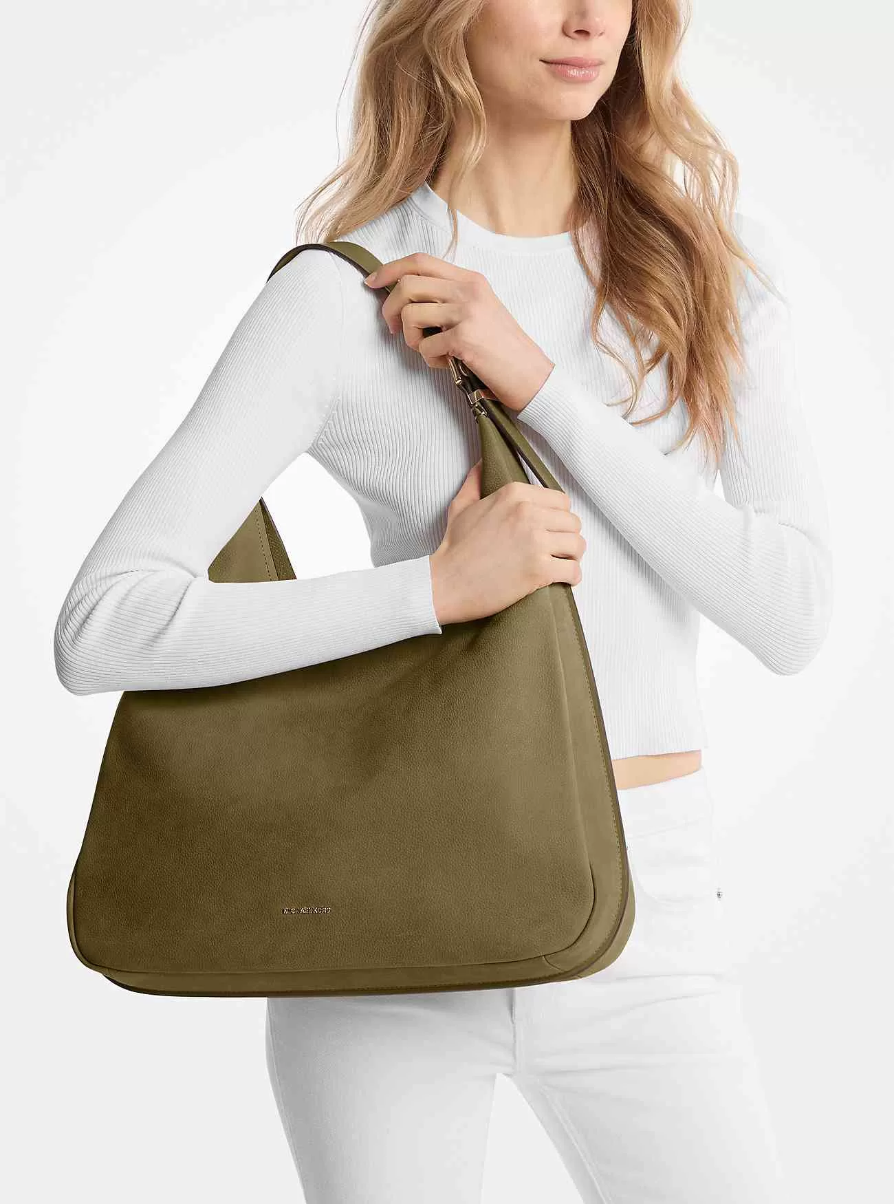 Nolita hoboväska ser avslappnad men ändå raffinerad ut i smidig nubuck med strukturerade kanter som definierar dess form. Den har en justerbar axelrem med polerade spännen och en stor öppen insida för att förvara allt du behöver.
