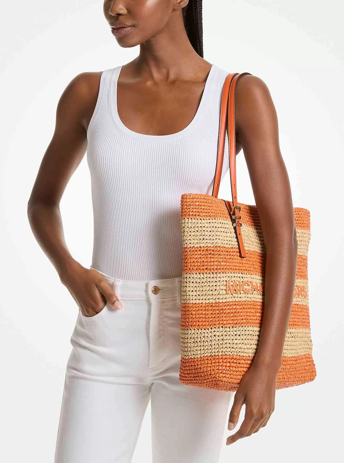 Vår Quinn-väska känns destinationsklar i handvirkat halm med färgglada ränder och läderhandtag som passar ihop. Med en rymlig interiör är den här lättsamma stilen det perfekta tillbehöret för att ta och gå på stan eller gå till stranden.