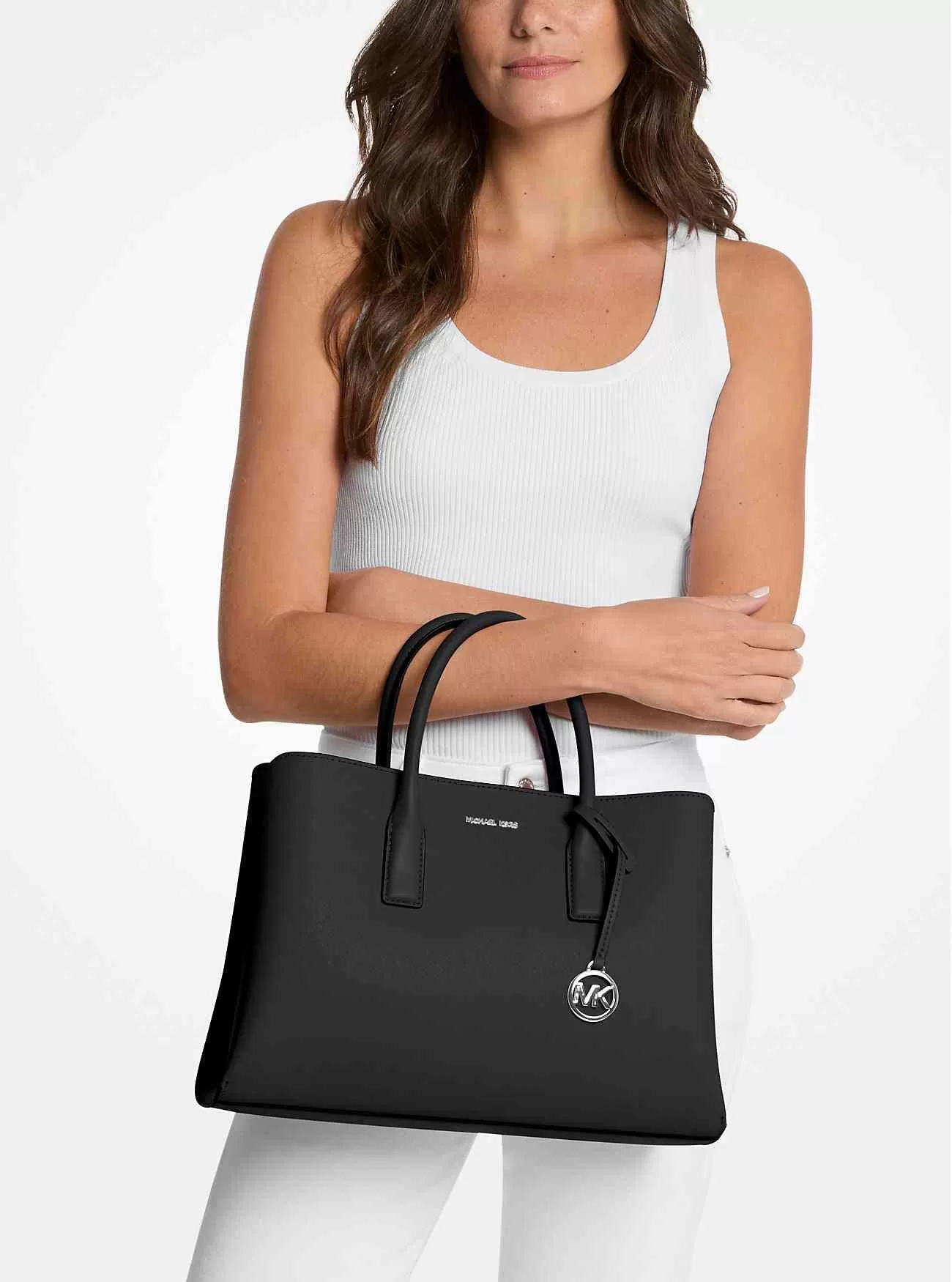 En förminskad version av det eleganta väsentliga, vår stora Ruthie-väska har en blandning av polerade och pragmatiska element i ett enkelt elegant paket. Tillverkad av Saffiano-läder, den är designad i en strukturerad siluett som vilar på silverfärgade nitar för sofistikerad tilltalande. Bär den i de snygga topphandtagen eller bär den crossbody när du är på språng.