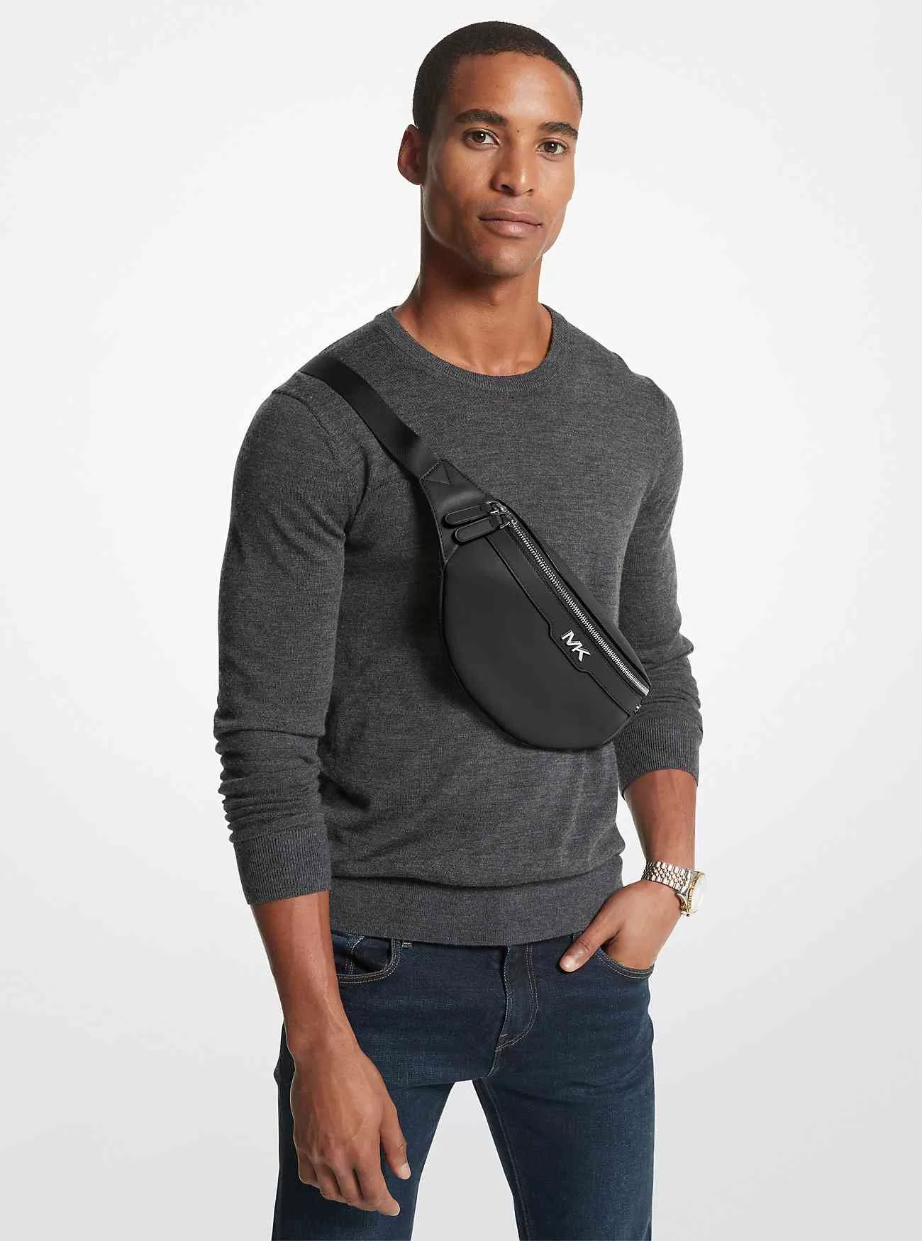 Varick-bältesväskan är ett perfekt tillbehör när du är på språng när du behöver enkel tillgång till några väsentliga saker. Tillverkad av slätt läder, den har en kompakt, logotypfodrad interiör och en justerbar rem med spänne. Bär din över ena axeln eller runt midjan, beroende på ditt humör.