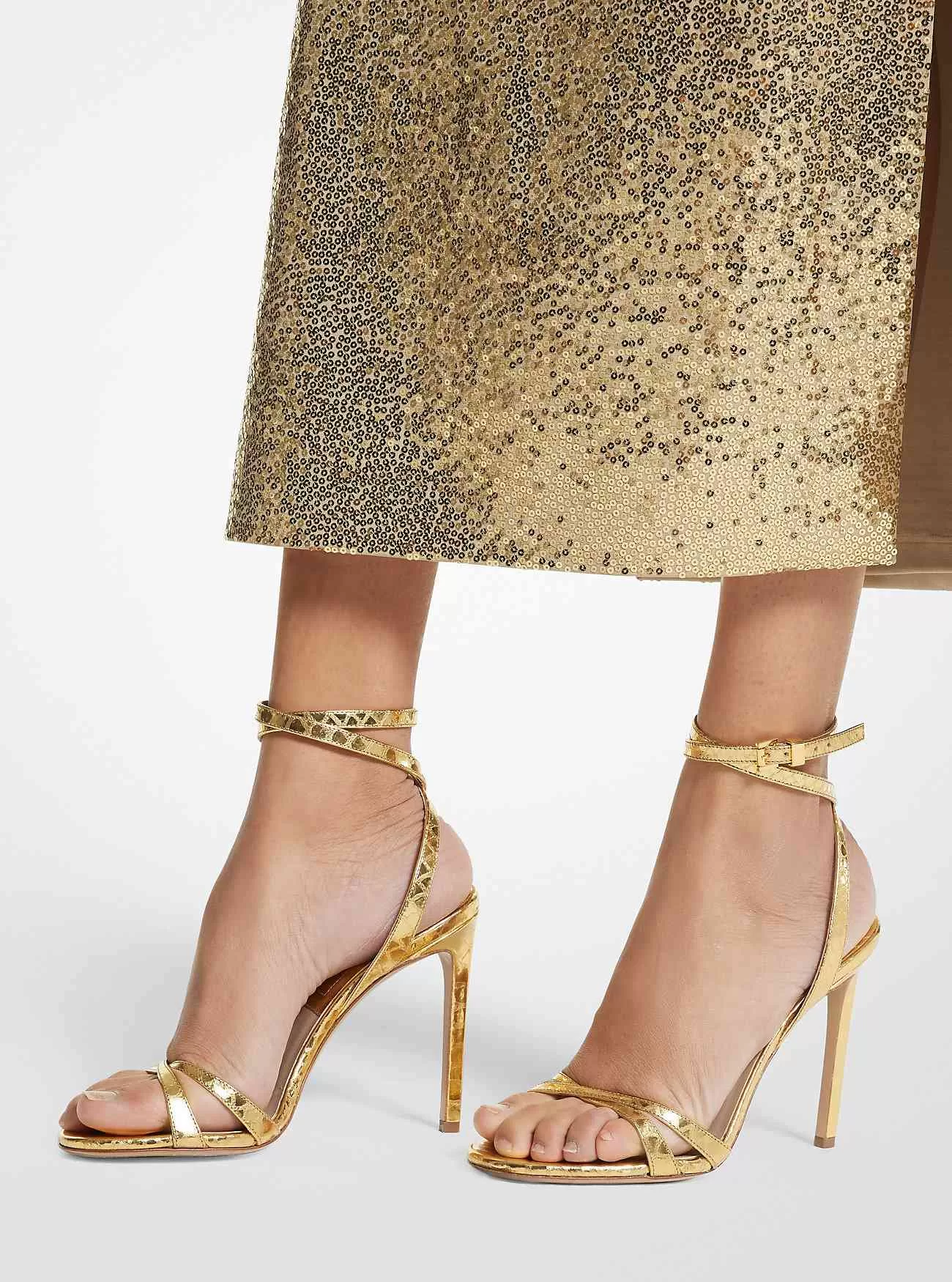 Chrissy-sandaler är utformade med sarongkjolar på landningsbanan våren/sommaren 2023 och är tillverkade i Italien av metalliskt, pytonpräglat läder. De har smala korsade remmar vid tårna och vristen och vilar på en benförlängande stilettklack. Med en sofistikerad men ändå lockande siluett kommer de snabbt att bli dina favoritskor för kvällen.