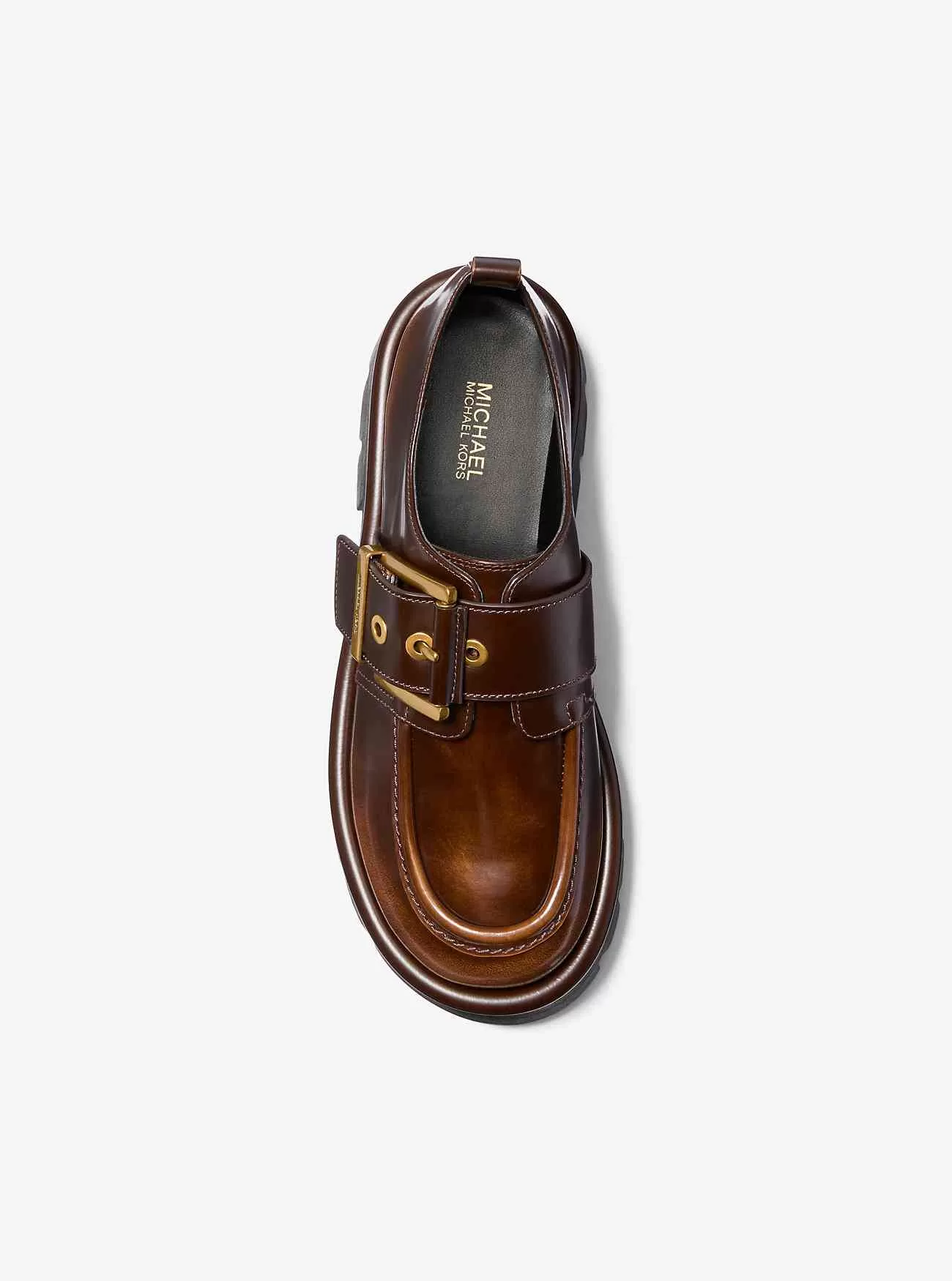 Våra Colby loafers är tillverkade av ett rikt polerat läder och placerade ovanpå en tjock överdimensionerad gummisula. De definieras av en polerad ovandel med spänne som ger lite kant åt helhetslooken. Balansera detta iögonfallande par med en feminin miniklänning för en fräsch look.