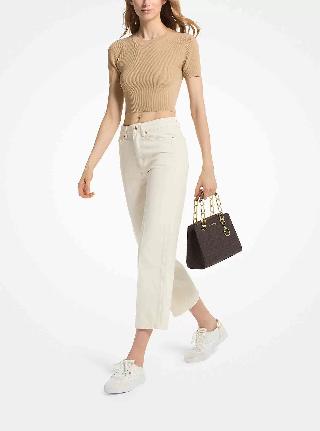 Vår Cynthia väska med logotyp är lika elegant och pragmatisk. Kedjetrimmade topphandtag och inslag av polerad hårdvara bidrar till dess feminina charm, medan en liten, fackförsedd interiör håller dina förnödenheter säkra och organiserade. Bär den crossbody på dagar som kräver en enklare attityd.