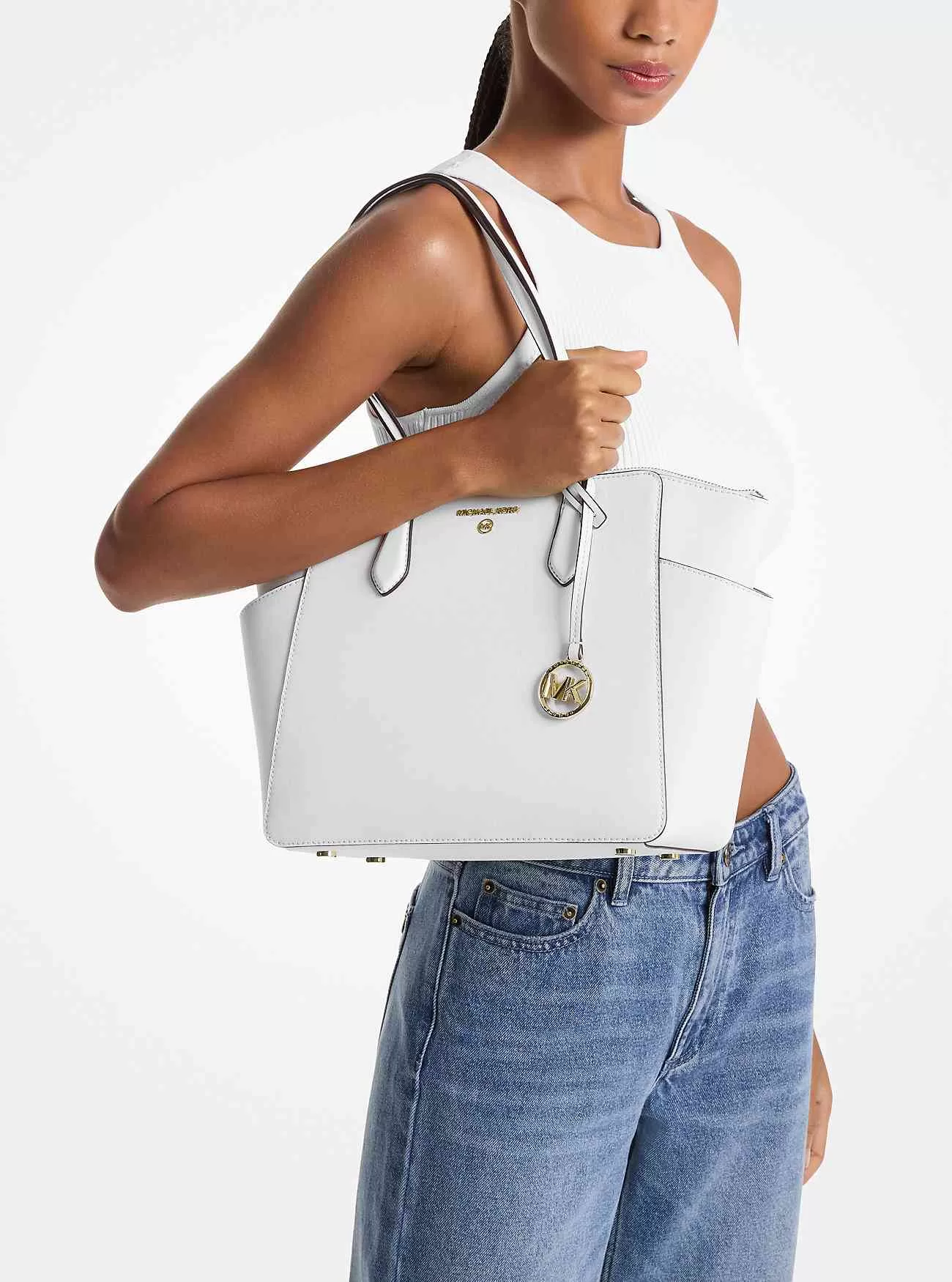 Vår Marilyn-väska är den ultimata väskan för vardagsbruk. Varumärkets ikoniska ”MK”-hårdvara lämnar ett minnesvärt märke, medan den strukturerade Saffiano-lädersiluetten öppnas för att avslöja en rymlig interiör med dedikerade fickor för dina dagliga nödvändigheter. Vi älskar hur de smala remmarna lätt glider över din axel för att säkerställa lätthet när du är på språng.