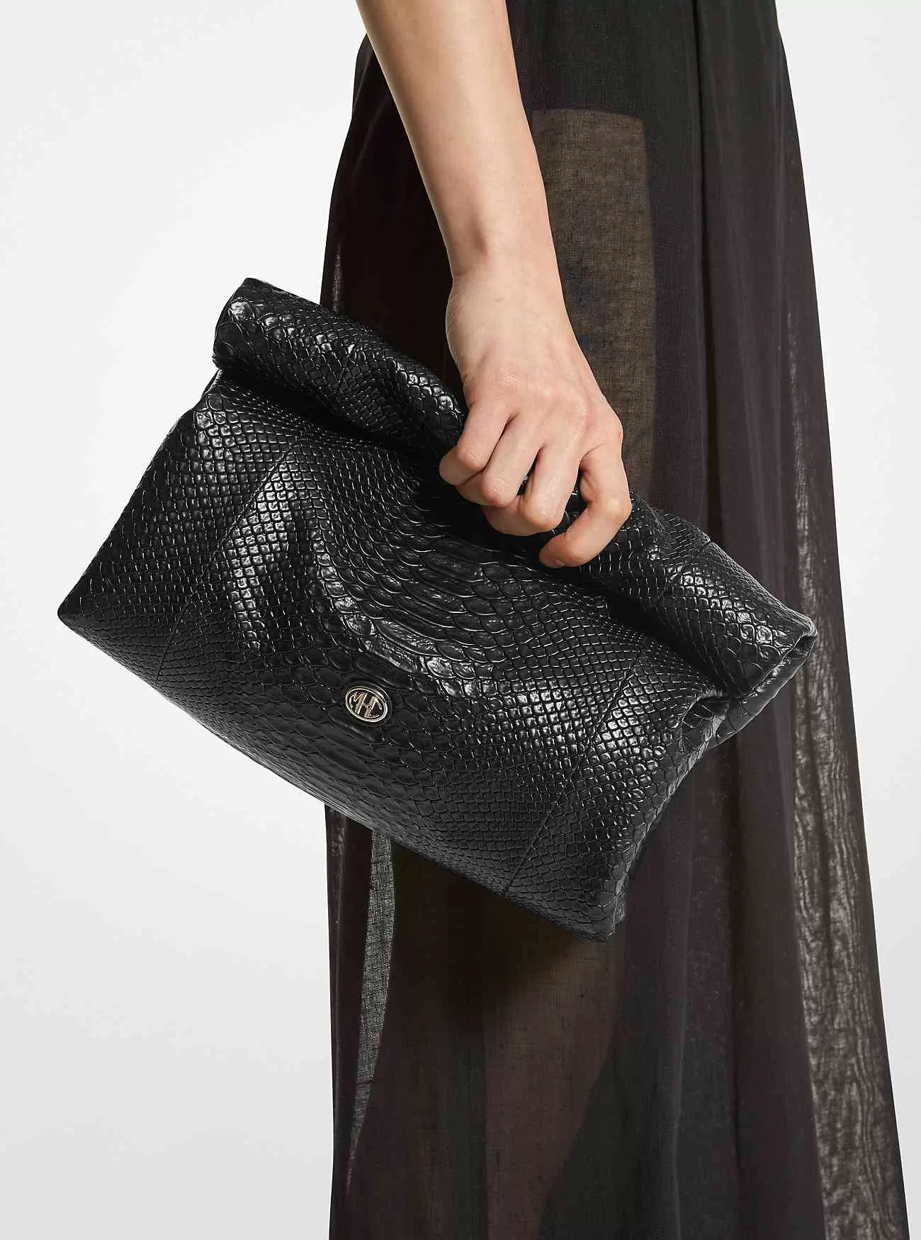 Den här kopplingen är tillverkad i Italien av pytonpräglat läder och gör ett exotiskt uttalande. Dess mjuka struktur och rullade topp utstrålar enkelhet, medan interiören har tillräckligt med utrymme för dina nödvändigheter. Säkrad med en dold magnetisk stängning och utsmyckad med vårt signatur MKC Monogram, är det en perfekt motpol till säsongens neutrala toner och flytande silhuetter.